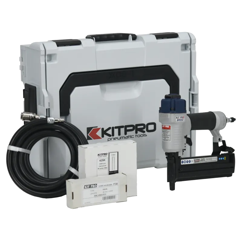 KITPRO cloueur et agrafeuse BS50-A1 COMBOPACK pour minibrads droits 18GA de F15 à F50 & agrafes fil moyen 18GA type 90/12 à 90/40, largeur 5,75 + tuyau 5m