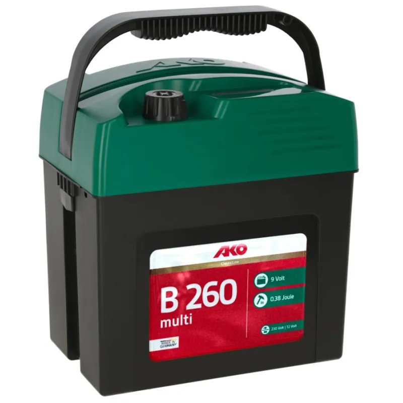 l'AKO Compact Power B 260 multi dispose d'une énergie de stockage de 0,38 J et d'une tension de 9 800 V. Il convient aux clôtures jusqu'à 4 km sans végétation. INFO : éliminez régulièrement la végétation afin d'éviter les dérivations et d'augmenter la sécurité du troupeau.