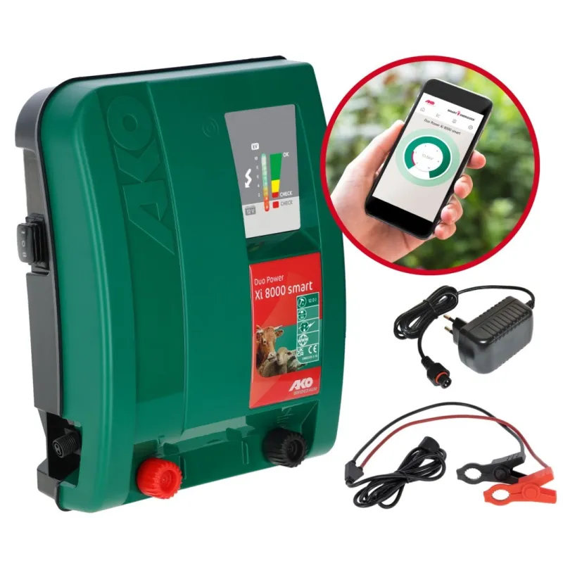 Puissance et longueur de la clôture : L’AKO Duo Power Xi 8000 smart est équipé d’une énergie de charge de 12 joules et d’une tension maximale de 11200 volts. L’appareil est utilisé pour des clôtures jusqu’à 50 km sans végétation.