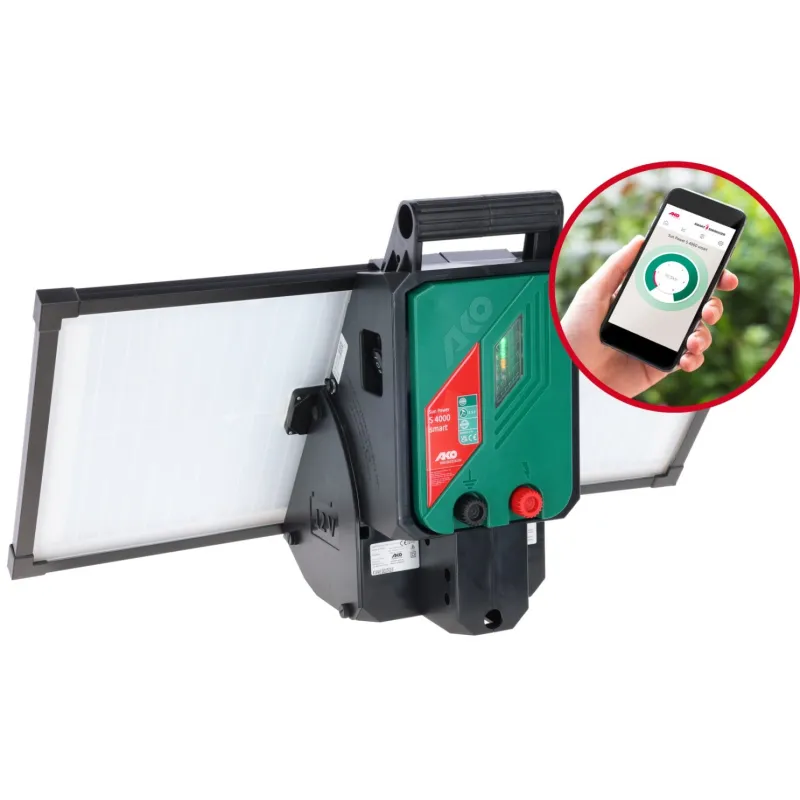 Puissance et longueur de la clôture : L’AKO Sun Power S 4000 smart est équipé d’une énergie de charge de 5,50 joules et d’une tension maximale de 11900 volts. L’appareil est utilisé pour des clôtures jusqu’à 35 km sans végétation.